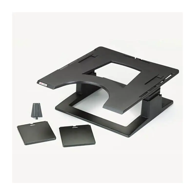 Statīvs ergonomiskai piezīmju datora novietošanai. Darba vietas ekonomija. Divas virsmas – datoram un aksesuāriem. Paredzēta vieta dokumentu turētājam 3M DH445. Izmēri: 320x320x100-160 mm.